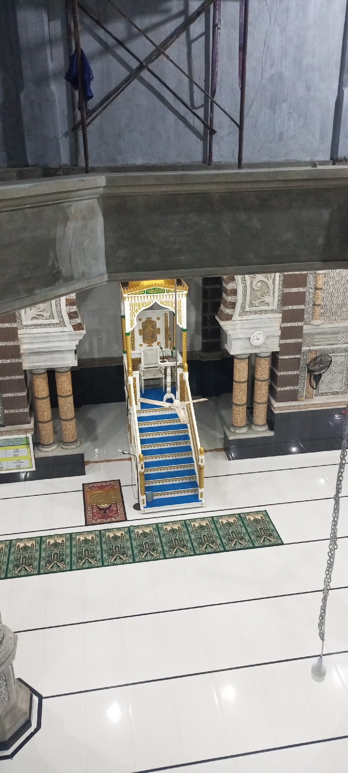The image displays the interior of a mosque, viewed from an elevated perspective