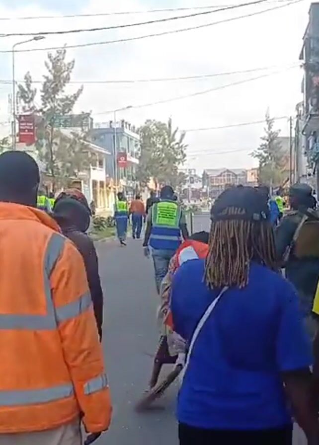 A group of people in a city street are engaged in what appears to be a cleanup effort. Many are wearing bright orange or yellow safety vests, with some also sporting gloves. Some vests have writing on them, including the phrases "BRIGADE SALUBRITE," "VILLE DE GOMA," and "SOCIETE VISION-NET." A few are picking up debris from the street, while others are walking further down the road. The street is lined with buildings, and there are trees visible in the background. Some of the buildings have commercial signs, including one for "airtel." The overall impression is of a community effort to clean up the street.
