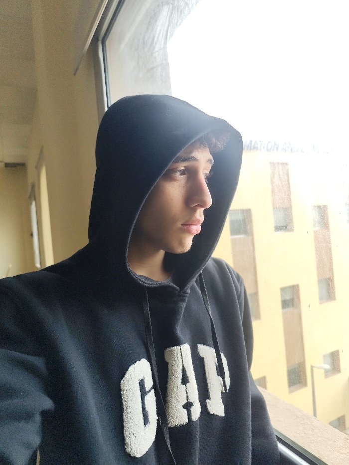 The image captures an individual in Jibb as-Safa, Syria, positioned indoors, looking out through a large window. The subject, appearing male with light skin and short, dark, curly hair, wears a black hooded sweatshirt with the hood covering the head. The front of the sweatshirt displays the word "GAP" in prominent, raised, white, textured letters. The individual is oriented in profile, facing towards the right side of the frame, gazing intently beyond the windowpane. The immediate interior background to the left of the subject features a plain, light beige or off-white wall, with a partial view of an arched opening further back. Through the window, an exterior scene is visible, dominated by a multi-story building with yellow-tan colored walls and numerous vertically aligned rectangular windows. Faint text, reading "FORMATION AN," is discernible on the upper portion of this exterior building. The exterior environment appears brightly lit and possibly overcast. A light fixture or pole is partially visible outside the window at a lower elevation.
