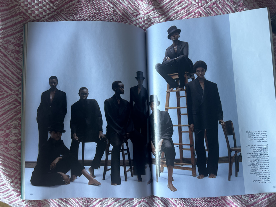 The image displays an open magazine spread, positioned vertically on its side, resting on a pink and white patterned textile surface. The magazine features a fashion editorial showcasing six individuals, predominantly adult males with dark complexions, dressed in various dark-colored suits and formal attire. The editorial background is a plain, light blue-grey studio setting with a reflective floor, showing inverted reflections of the subjects and props. On the left page, four figures are depicted. One figure, near the top, is in a dynamic pose, possibly climbing or leaning on a wooden chair. Below, another figure stands barefoot, wearing a dark suit. A third figure, also in a suit and barefoot, appears to be seated or balancing on a wooden chair. A fourth figure, partially visible at the bottom, interacts with another wooden chair. One person wears a dark fedora-style hat. On the right page, two prominent figures are visible. One is seated with bent legs on a wooden chair or ladder-like structure, dressed in a suit and a dark hat. Another figure stands or leans near the bottom of the page. All visible individuals are wearing dark, tailored clothing, and most are barefoot. Textual elements, likely credits or captions, are visible on the left page, including names of models and fashion brands such as "CELINE," "MAISON MARGIELA," "THOM BROWNE," and "SAINT LAURENT." The page number "122" is visible in the upper left corner of the left page. The surface supporting the magazine is a woven or knitted fabric displaying a prominent chevron or zigzag pattern composed of alternating pink and white stripes. The location in the city of Reigate and Banstead, United Kingdom, cannot be determined from the provided image. The image depicts a portable magazine on an indistinguishable indoor surface, offering no geographical context.