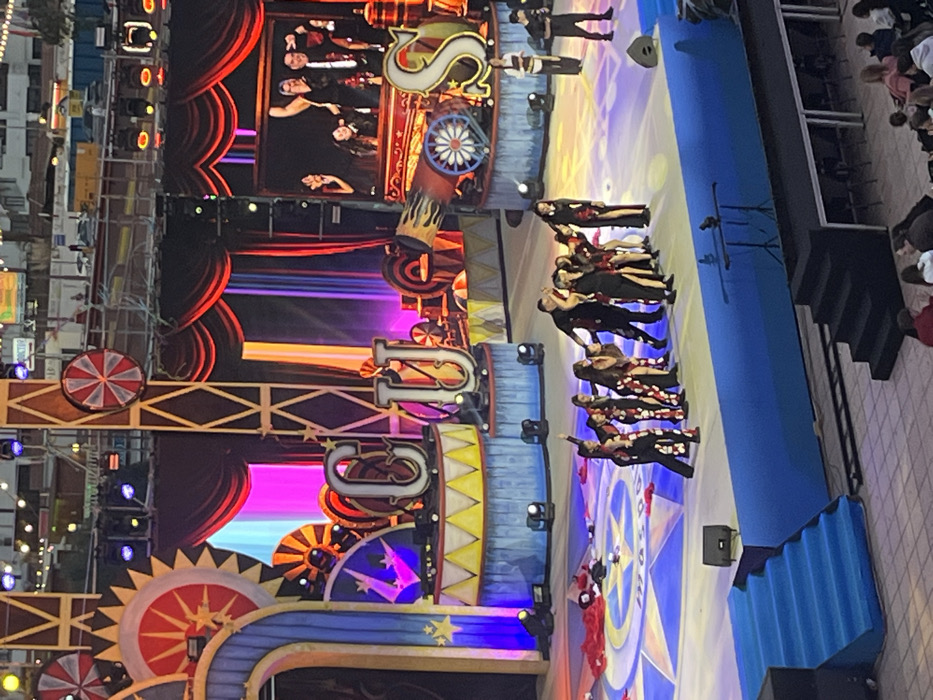 The image captures an outdoor stage performance or event at night in San Bartolomé de Tirajana, Spain. The primary focus is a large, brightly lit stage featuring a circus or carnival theme. The stage backdrop includes large, illuminated letters "C I U S", stylized wheels resembling pinwheels, red draped curtains, and a decorative cannon prop. The main performance area is a light-colored surface adorned with a central circular design incorporating a star and partial text. Approximately 11 to 12 individuals are actively performing in the mid-ground of the stage. The majority are women, dressed in black costumes with red and white patterns, many featuring long slits. They are arranged in a dynamic formation, striking poses with raised arms. Two male performers in black attire are also part of this group. Scattered red fabric items are visible on the stage floor to the left of the performers. To the right of the performers, a woman in a black and white striped dress stands near the stage edge. Further right, a man in black clothing holds a camera, facing the performers as if documenting the event. A large rectangular screen on the right side of the stage displays a live or pre-recorded image of four individuals, three men and one woman, all in black, posing and smiling. The foreground consists of a blue stage platform with black stairs leading up from the audience area on the right, and blue stairs on the left. The top of audience members' heads are partially visible in the bottom right, seated in dark chairs. The background, beyond the stage setup, shows indistinct urban structures and lights. The scene is illuminated by multicolored stage lighting, creating a vibrant atmosphere.