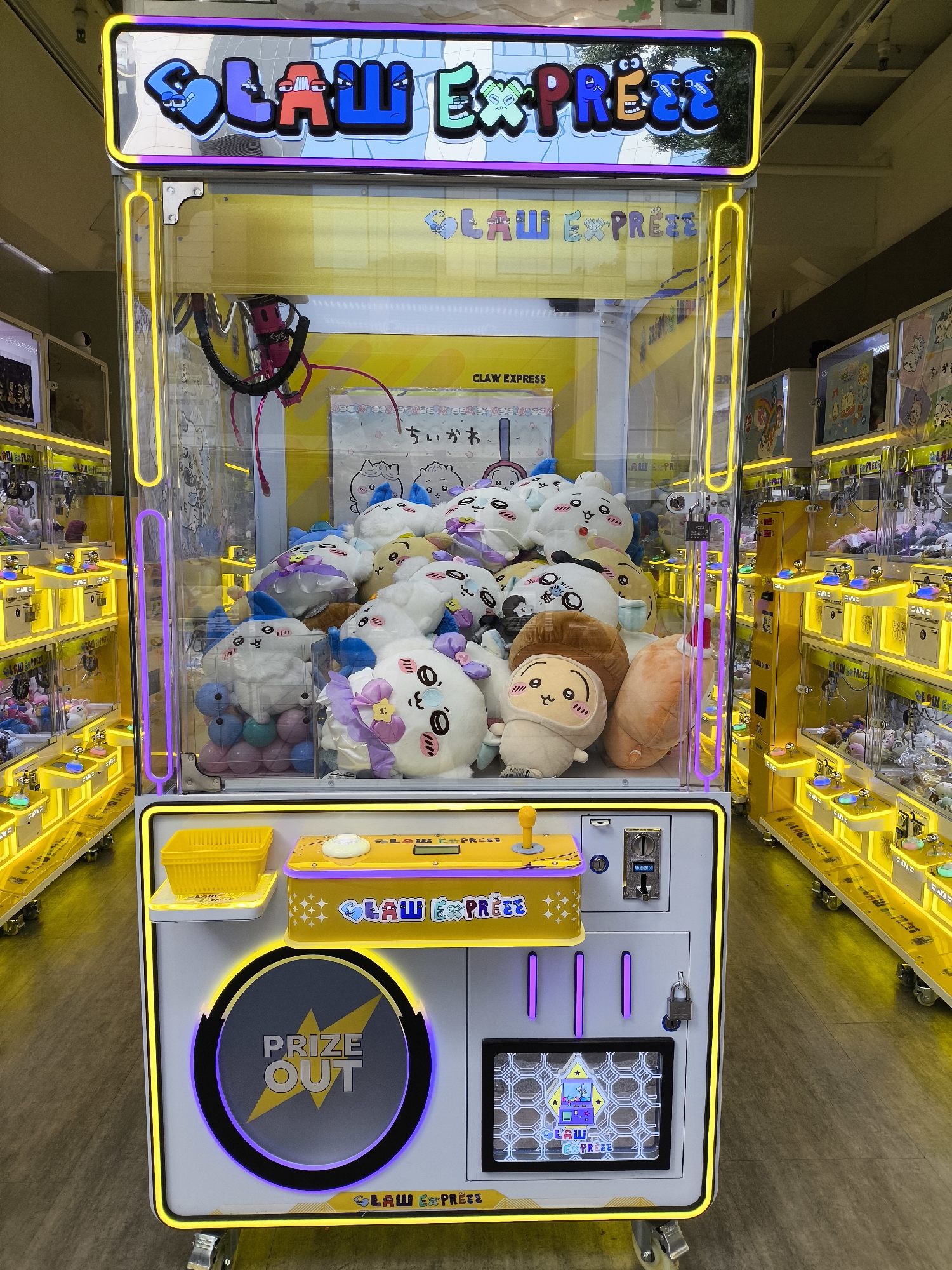 The image showcases a "Claw Express" claw machine filled with various plush toys, likely located in an arcade or entertainment venue in Hong Kong, China
