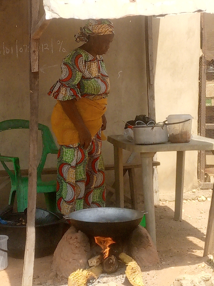 An adult female is standing in an outdoor cooking area in the city of Unknown, Unknown. She wears a vibrant, multi-patterned tunic in green, orange, white, and black, a solid yellow wrap skirt, and a matching headwrap. She faces slightly right, looking down towards a cooking setup. A large, dark-colored wok rests on a traditional reddish-brown clay stove, where an open fire burns with visible flames and embers fueled by wood or dried plant material. To her right, a light-colored table holds a metallic pot, a translucent plastic bucket containing brown granular material, and additional dark items. A green plastic chair is partially visible behind her to the left. The background features a light-colored, unpaved ground and a beige wall. White chalk markings, "101 / 071 / 12 / %", are visible on the left side of the wall. To the far right, a metallic grid structure with green elements, one marked "100", is present. A wooden post on the left supports a light-colored fabric canopy overhead. The scene is under natural daylight, casting shadows on the ground.
