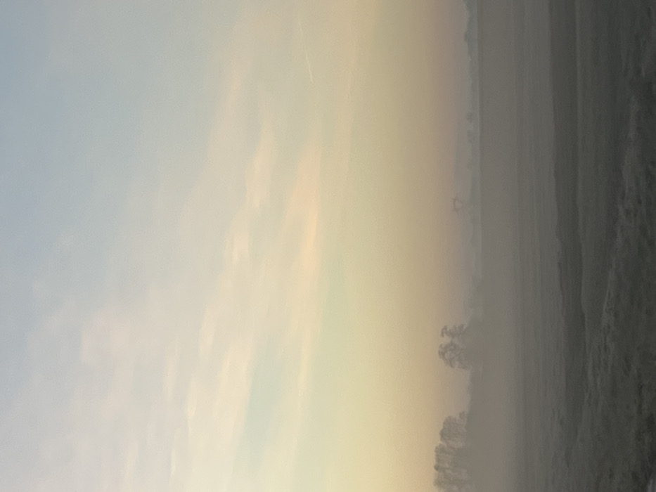 A hazy landscape stretches horizontally, with the sky on the left transitioning from blue to pale yellow