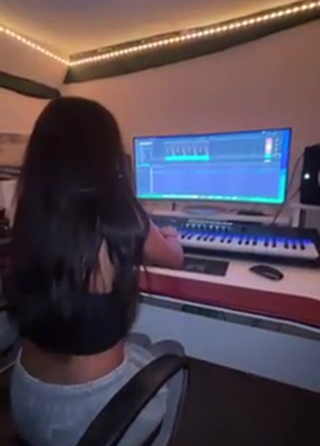 A young woman with long, dark hair is seated in front of a large computer monitor and a keyboard, seemingly in a music production environment. She is wearing a black crop top and grey sweatpants. The monitor displays music editing software with sound waves visible, and the woman appears to be interacting with the keyboard. The room is dimly lit with a string of small lights along the ceiling, creating a warm ambiance. Other objects visible include a computer mouse, studio speakers, and a padded chair. The overall impression is that she is working on a music project.