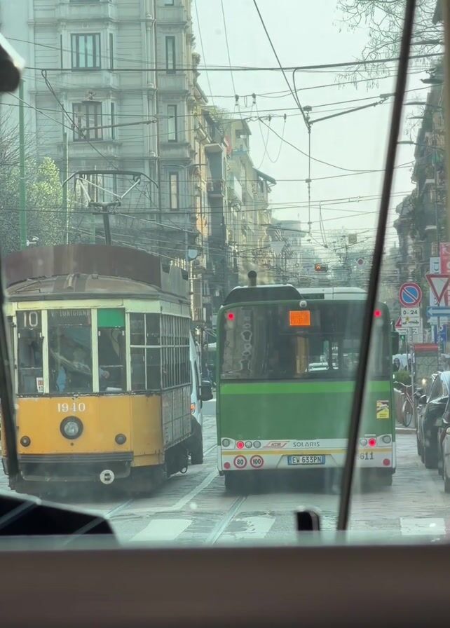 The video, filmed from the interior of a vehicle, shows a street scene in a European city