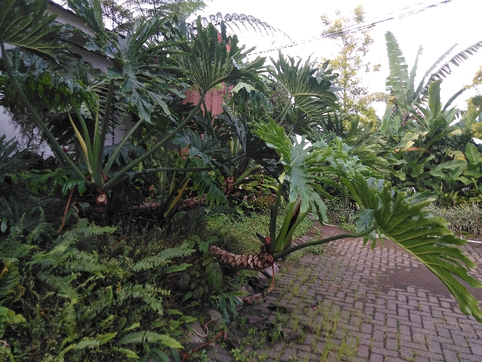 The image displays a lush tropical garden scene in Sintgaing, Myanmar, under an overcast sky. Dominating the foreground and mid-ground are several mature *Thaumatophyllum bipinnatifidum* (formerly *Philodendron selloum*) plants, identified by their thick, woody, segmented brown stems and large, dark green, deeply lobed leaves. Densely packed ferns and other green ground cover foliage surround the base of these plants. A light-colored brick-paved pathway, featuring a diagonal pattern, occupies the right side of the frame, extending from the mid-ground to the foreground. In the background, more tropical vegetation is visible, including tall banana plants with broad green leaves on the far right. A pale building wall is partially obscured by foliage on the far left. No individuals, animals, or specific objects of human interaction are present within the depicted environment.