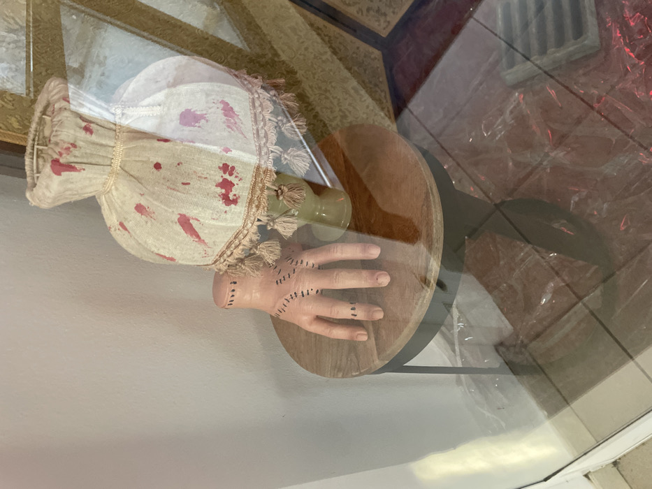 A macabre lamp rests inside a glass enclosure. The lampshade is off-white with bloody splatters. The base is a severed, pale hand, marked with stitch lines. The lamp sits on a round, wooden plate. The glass distorts the background, revealing a patterned floor and ceiling. The overall scene is unsettling and theatrical, utilizing contrasting elements of domesticity and horror.