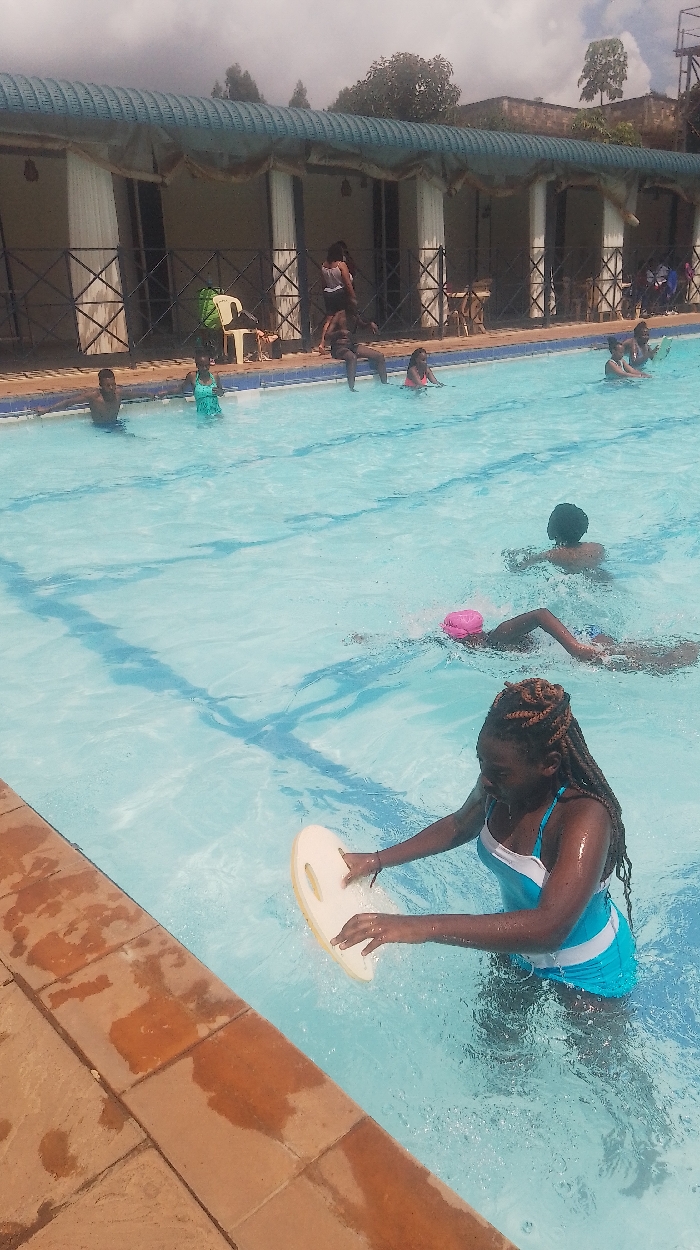 This image captures an active outdoor swimming pool scene located in Kikuyu Township ward, Kenya