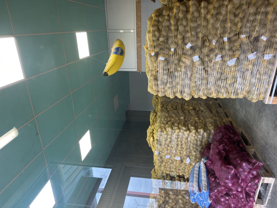 This image captures the interior of a produce storage facility or warehouse in Plodovitovo, Bulgaria, viewed through a large glass panel. The scene is dominated by multiple, densely packed stacks of produce. In the foreground and extending into the midground, large quantities of potatoes are visible, contained within yellow mesh bags. These bags are meticulously stacked on wooden pallets, forming tall, rectangular khối, and are subsequently wrapped in clear plastic film for stability. To the left, a separate wooden pallet supports bundles of red onions, identifiable by their deep red color and purple mesh bags. Additionally, several blue bags, of unknown contents, rest on this same pallet. The floor appears to be a light gray concrete. Above the stored produce, the ceiling features teal-green rectangular panels with a lighter grid system. Multiple square LED panel lights and one linear fluorescent tube light are integrated into the ceiling, illuminating the space. Suspended from the ceiling by a thin filament is a yellow inflatable banana, prominently displaying the "Chiquita" brand logo in blue text. The glass panel through which the image is taken reflects an exterior scene, including a cloudy sky, a distant structure with a red architectural accent, and a potential landscape, suggesting the building is near an open area. A reflection of an interior linear fluorescent light is also visible on the glass. No individuals are present within the depicted area of the facility.