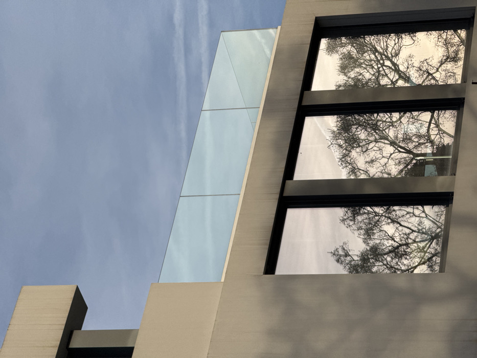 An exterior view depicts a modern building in Sant Cugat del Vallès, Spain, under a blue-gray, partly cloudy sky. The structure features a light gray facade with a prominent, geometric cantilever extending from the upper left. A rooftop terrace is visible, enclosed by a clear glass railing that reflects the muted sky. Below this terrace, three large, rectangular windows with dark frames are positioned. These windows reflect the intricate, bare branches of deciduous trees, along with portions of a brighter, lightly clouded sky. Shadows are cast diagonally on the left side of the building's facade, indicating a light source from the right. No individuals, activities, or interactions are present in the scene.