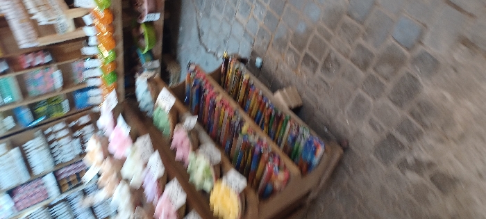 The scene depicts an indoor market stall or shop situated within the city of Marrakesh, Morocco. The image is significantly blurred, showing a cluttered display of various merchandise. A prominent multi-tiered wooden shelving unit dominates the left and central foreground. On its upper levels, multiple small baskets or bowls contain pastel-colored items, possibly artisanal soaps or confectionery, in shades of pink, white, cream, green, and yellow, each accompanied by a small white label. Below these, two lower wooden shelves are packed with rows of individually wrapped, rectangular packages or bars, exhibiting diverse bright colors such as red, blue, green, yellow, and orange. In the background, against a light wall, additional wooden shelves are visible, holding numerous items including rows of orange and green bowl-like containers. The floor is covered with dark grey, rectangular cobblestones or paving stones. No individuals, specific actions, or interactions are discernible. The environment is consistent with a traditional market setting, likely indoors with artificial illumination.