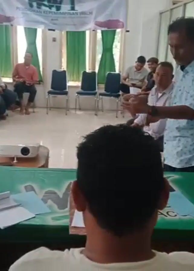 The video captures a meeting in what seems to be an office setting. A group of approximately ten men are present, some seated in chairs arranged in a circle, facing towards the front of the room. At the front of the room, a man stands speaking, gesturing with his hands. To his right is another man standing passively. A table sits in the foreground, holding a laptop, papers, and a projector is visible further back. A banner hangs on the wall with writing on it. The room is lit with natural light filtering through windows covered by green curtains.