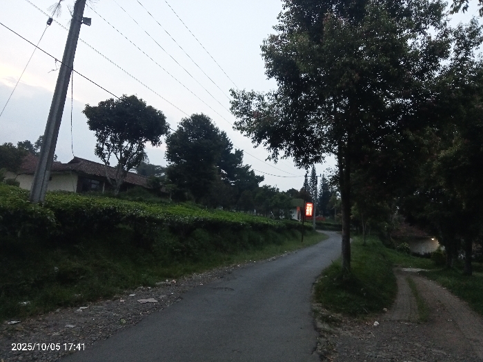 This image depicts a rural or semi-rural landscape in the city of Unknown, Vietnam, captured at 17:41 on October 5, 2025. The scene is dominated by a paved asphalt road that curves gently uphill towards the right side of the frame. To the immediate right, a dirt path branches off the main road, also ascending. On the left side of the paved road, a steep, grassy embankment is covered with dense, manicured green foliage, possibly indicative of a tea plantation. Two single-story buildings with traditional reddish-brown tiled roofs are visible on the higher ground behind this vegetation, partially obscured by trees. A tall utility pole with multiple overhead wires stands prominently in the left foreground, angling slightly towards the right. The right side of the road is bordered by large, mature trees with dark green foliage. Further along the paved road on the right, a vertical, rectangular sign with a reddish-orange illuminated display is visible. Beyond this, along the dirt path, another building with a similar tiled roof is partially visible amidst the trees. The sky is overcast and light grey, suggesting late afternoon or early evening conditions. No individuals or vehicles are present in the frame.