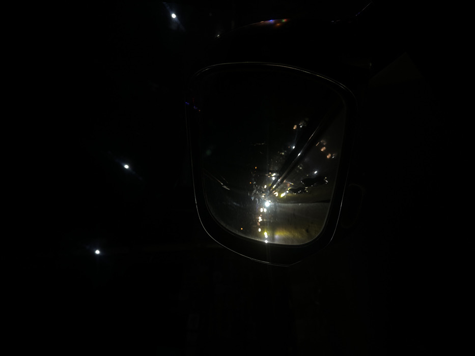 In the darkness, a rectangular mirror reflects a night scene. The image shows a blurry road illuminated by headlights, possibly from another vehicle, creating streaks of light. Distant lights, perhaps from buildings or streetlights, dot the background. The mirror itself has a dark frame and sits against a completely black backdrop, save for a few indistinct, small white specks on the left.