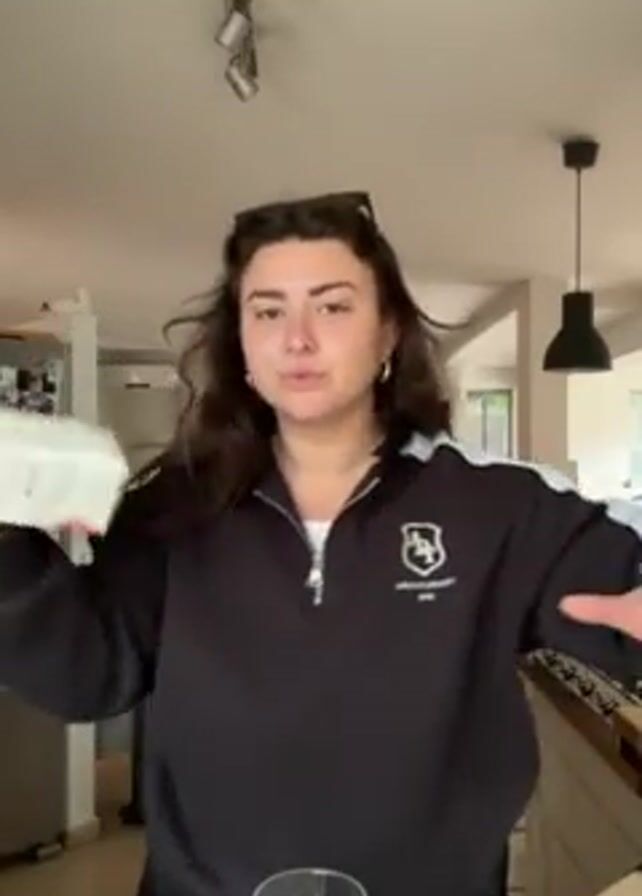 The video features a young woman with dark brown hair standing in a kitchen, preparing a beverage
