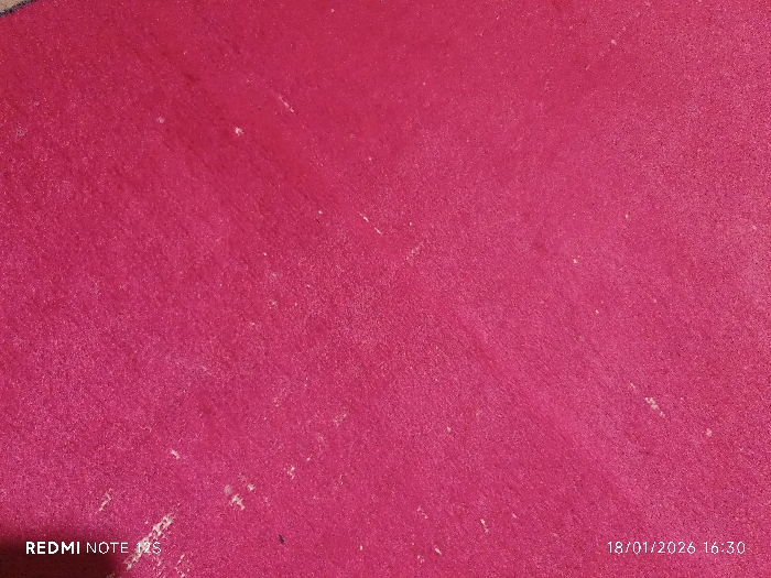 The image presents a close-up, slightly angled view of a textured, magenta-colored surface, consistent with a textile material such as carpet or fabric. The surface exhibits numerous small, irregular light-colored particles, indicative of dust, lint, or other particulate debris scattered across it. The lighting is diffuse, without distinct shadows. No individuals, identifiable objects beyond the textured surface and debris, or specific actions or interactions are visible within the frame. Overlaid text in the bottom left corner reads "REDMI NOTE 12S", identifying the capture device. Text in the bottom right corner displays a timestamp "18/01/2026 16:30". The specific location within Andijan City, Uzbekistan, cannot be determined from the visual information provided in the image.
