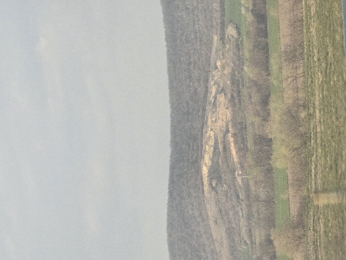 The image displays a rural landscape near Yazdach, Bulgaria, under an overcast sky. Approximately the upper 40% of the frame consists of a light grey sky with minimal cloud definition. Below this, a series of rolling hills covered in sparse, dormant deciduous trees occupies the background and midground, presenting a brownish-grey hue indicative of late winter or early spring. On a central hill in the midground, a substantial excavation or quarry site is visible, characterized by exposed areas of light brown and beige earth devoid of significant vegetation. Below the hills, the terrain features a patchwork of agricultural fields; some sections display nascent green growth, while others appear as dark brown, recently tilled soil. Scattered clusters of bare or budding deciduous trees are interspersed among these fields. A single, tall, light-colored pole, consistent with an electrical or communication pylon, stands vertically in the mid-left, rising above the tree line. The immediate foreground shows a blurred expanse of grassy ground. No human activity, figures, or discernible structures beyond the pylon and potential cultivation are present.
