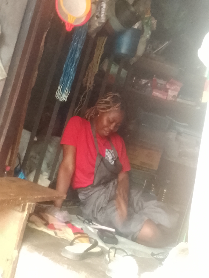 A woman in a red shirt and gray apron sits on the ground in a cluttered space, possibly a small shop or storage area. Her hair is blond and styled with braids. She appears to be engaged in a task, focusing her gaze downward. Around her are various items, including shelves filled with products, hanging objects like rope and a strainer, and sandals scattered on the floor. The space is dimly lit, with a mix of natural light and shadows.