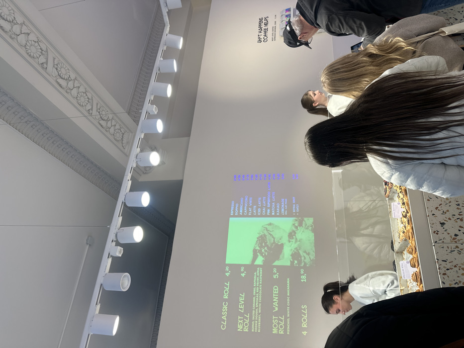 The interior of a cafe in Heidelberg, Germany, located at latitude: 49.411, longitude: 8.701. There are white track lights overhead and a white tiled floor. There is a glass case with baked goods on display. Several people are standing in line in front of the counter. A digital menu displays various coffee drinks and pastries. A sign reads "Shit Happens Coffee Helps" on the wall. A person is taking a photo of the menu with a phone. A group of four people are in line, two women and two men, with their backs to the camera. One of the men is wearing a black shirt and baseball cap. The women in the line are wearing long hair and white shirts. The cafe is clean and well-lit.