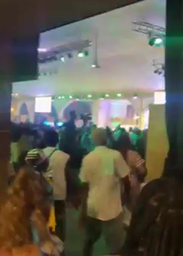large indoor gathering with people dancing. The lighting changes colors throughout the video, alternating between green, blue, red, and yellow. There is a stage area in the background with screens. People are dressed in various styles of clothing, and a few individuals are closer to the camera. The camera seems to be moving through the crowd. The scene appears to be festive and energetic.