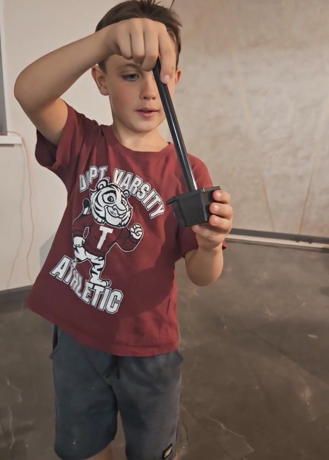 A young boy is standing in a room, holding a toy flower pot with a green and red plant inside. He is wearing a red shirt with a cartoon tiger on it and gray shorts. The room has light-colored walls and a gray-tiled floor. The boy holds a black rod in his left hand and the pot in his right. He turns the rod, and the plant pops up out of the pot. He smiles and looks at the camera.