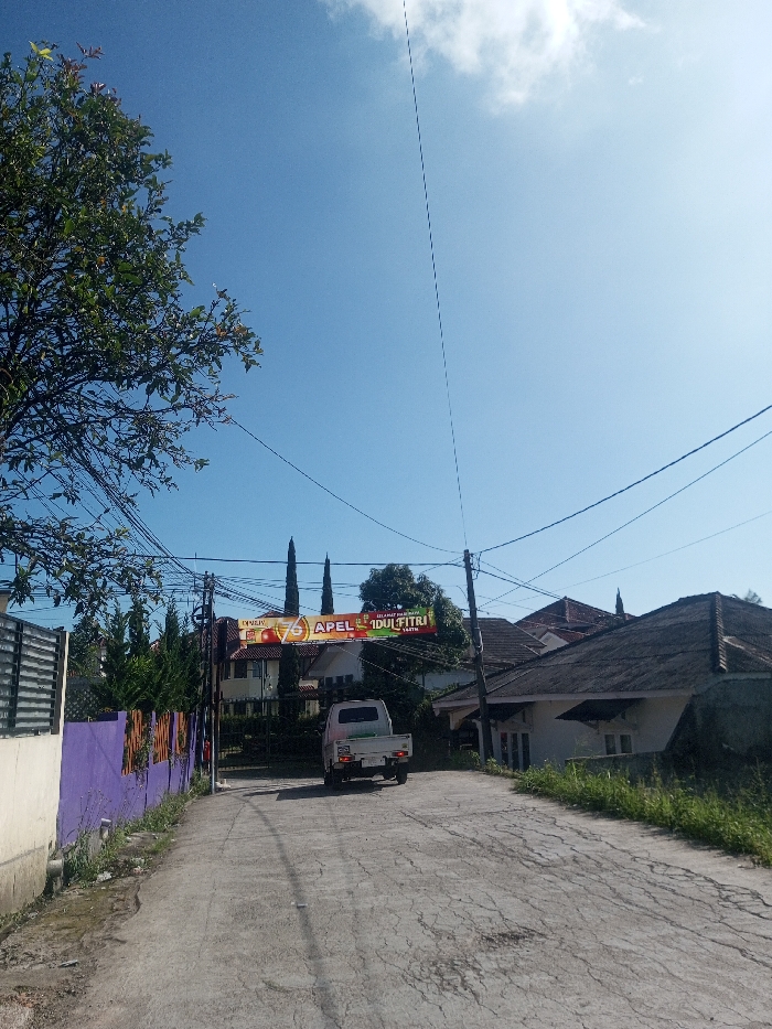 This image depicts a residential street scene in Niz Lakuk, India, under a clear, bright blue sky with sparse white clouds. A paved, cracked gray road leads uphill and slightly curves to the left in the distance. A white pickup truck is visible from the rear, positioned centrally on the road, heading away from the viewer. On the left side of the foreground, a large tree with dense green foliage partially obscures a building with a purple wall or fence. Numerous black power lines and communication cables crisscross overhead, supported by utility poles, one of which is prominent near the center. Stretched across the road, suspended by wires, is a colorful banner, predominantly red and yellow, bearing partial text "SELAMAT HARI RAYA" and "APEL IDUL FITRI," along with the number "76." Beyond the banner, several residential houses with dark, sloped roofs and light-colored walls are visible, interspersed with green trees and shrubs, including two tall, slender conical trees. The right side of the road features an unkempt grassy verge. No individuals are present. The scene is illuminated by direct sunlight.