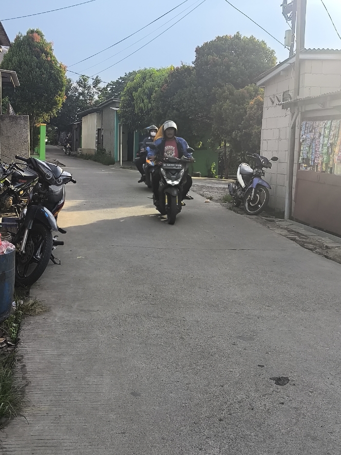 A concrete road, likely residential, in the city of Unknown, Indonesia, is depicted under clear daylight conditions. Three individuals are riding motorcycles towards the viewer. The lead rider wears a white helmet, a blue jacket over a red t-shirt, and dark pants, operating a dark-colored scooter with license plate D 5874 FGR. A second rider, wearing a dark helmet and light-colored face mask, follows directly behind on a similar dark scooter. A third, less distinct rider is further back. On the left side of the road, several motorcycles are parked, including a black scooter and a black sport bike, adjacent to a light-colored concrete wall and a blue barrel. On the right, a blue and white motorcycle is parked next to a single-story building constructed of light-colored cinder blocks, featuring a dark roll-down door and papers affixed to its facade. The road is lined with patches of grass and various trees with green and reddish-green foliage. Electrical wires crisscross the clear blue sky overhead.