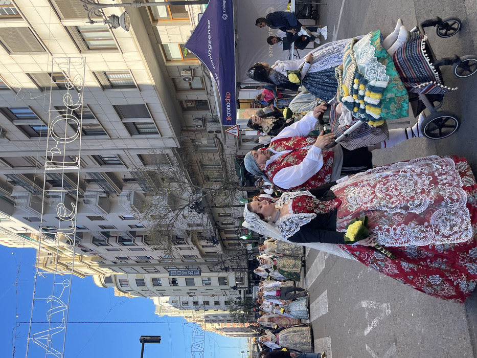The image depicts a daytime street scene of a cultural procession in Valencia, Spain