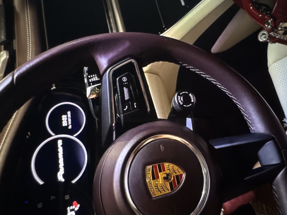 A close-up view showcases a Porsche steering wheel