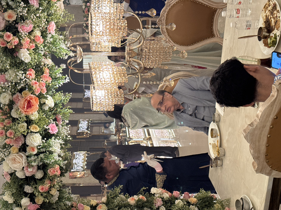 An indoor event with floral arrangements, chandeliers, and tables set for dining. People are seated at tables, including an older man in glasses and a younger individual using a cell phone. Another person wears white gloves and a dark-colored garment with gold trim. The scene is reflected in a mirrored wall, creating a repeated visual effect. Water bottles and plates of food are visible on the tables.
