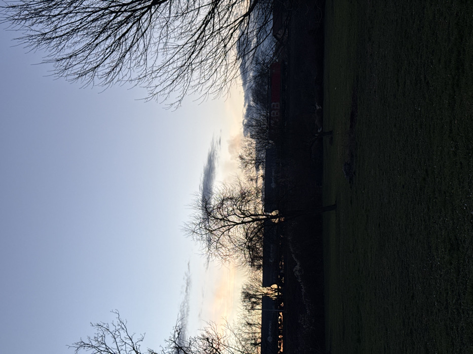The image depicts a scene at twilight or dusk. Bare tree branches are silhouetted against a pale blue sky with hints of orange and yellow near the horizon. A dark, grassy field occupies the lower right. Silhouetted trees and buildings are visible along the horizon line. A vertical cloud formation adds dimension to the skyline. The overall mood is tranquil and melancholic.