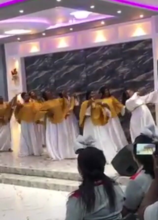 A group of women are performing a dance in a brightly lit room with high ceilings. They are wearing white dresses with gold shawls and move in unison. The room appears to be a church or performance hall, as evidenced by the large speakers and the stage-like area where the women are dancing. The audience is watching the performance, and one person is recording it on a cell phone. The lighting in the room includes purple and green neon accents.
