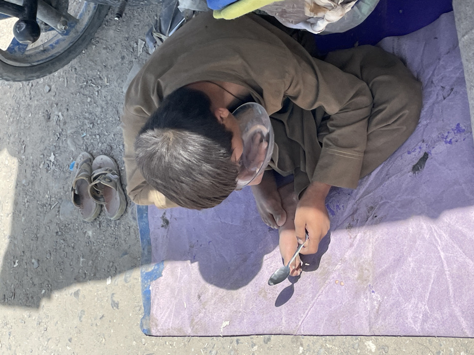 A single male individual is seated on a crumpled, light purple mat on an unpaved dirt and gravel surface. He wears a loose-fitting, brown or olive-colored garment and is barefoot. His head is bowed, with a clear, shallow, circular plastic object positioned over his lower face, obscuring his mouth and nose. His right hand holds a silver spoon, oriented with the bowl facing downwards towards the mat. His left hand rests near his right knee. A pair of worn, brown open-toed sandals are on the ground behind the individual. In the upper right background, the lower portion of a blue motorcycle wheel with spokes is partially visible. Strong shadows are cast across the mat and ground, indicating direct sunlight. Crumpled white and yellow/green material is visible to the individual's right, within a blue container or bag. The scene is located in the city of Spin Boldak, Afghanistan.