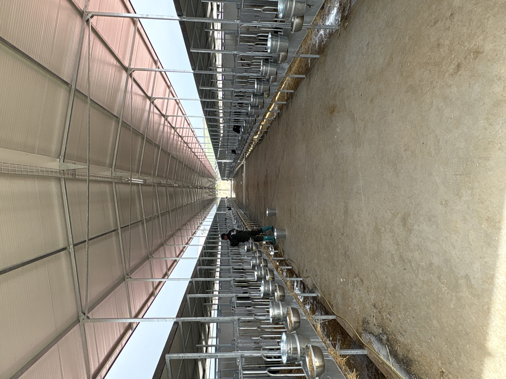 A single person, dressed in dark clothing and green boots, is seen working in an agricultural setting. They are positioned near a row of metal structures resembling feeding troughs. The setting appears to be a barn or enclosed agricultural facility with a concrete floor and a metal framework supporting the roof. The exact city location is unknown.