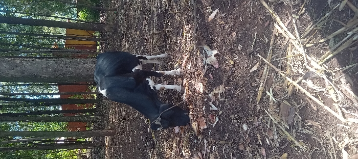 - "The image displays a black and white bovine, likely a young calf or heifer, positioned on dark, exposed earth" by FM-iEg4i1, licensed under CC BY 4.0