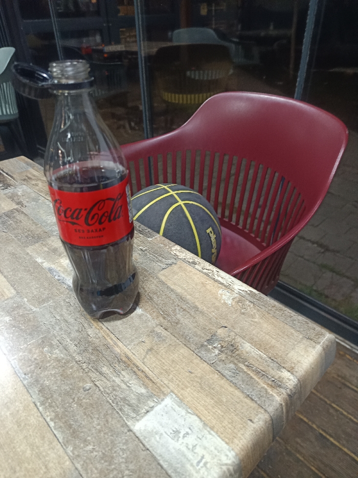 An eye-level shot captures a static scene within a commercial establishment in Dobrich, Bulgaria. A clear plastic Coca-Cola bottle, approximately half-full of dark liquid, rests on a light wood-patterned table surface in the foreground. The bottle features a red label with "Coca-Cola" and the Cyrillic text "БЕЗ ЗАХАР" (Sugar Free); its black flip-top cap is open and angled upwards. To the immediate right, a dark red slatted plastic chair partially holds a dark grey basketball with yellow accents, including the word "Player." The background reveals large glass windows reflecting muted light sources and indistinct indoor elements, consistent with a nighttime or low-light setting.
