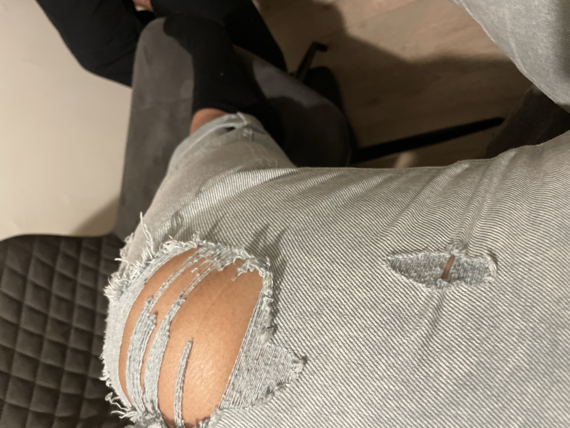 The scene depicts an indoor environment in Dronten, Netherlands, featuring two individuals seated. In the foreground, the right leg of a person is visible from the upper thigh to the calf, wearing light blue distressed denim jeans. The jeans exhibit large horizontal tears across the knee, revealing light brown skin, and a smaller, triangular rip on the lower thigh. The denim fabric displays a distinct diagonal weave pattern with frayed edges around the rips. To the right, a second person's lower leg and foot are partially visible, clad in black trousers and a black sock. The background includes a dark grey quilted chair back in the upper left quadrant. A dark grey upholstered surface, likely the seat or armrest of a chair, is visible in the middle right. The floor appears to be a light-colored panel material, possibly wood or laminate, with black chair legs extending to it. Walls in the background are light-colored. Both subjects appear to be in a relaxed, seated posture.