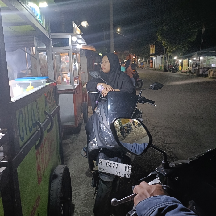 A woman wearing a black hijab is sitting on a black motorcycle with a license plate that reads "H 6477 YF 01-29". The motorcycle is parked near a food cart. The woman is holding a small, white object in her left hand. The food cart is brightly lit, and its signage is obscured by shadows. The street is well lit and empty. The scene is located at -6.958 latitude and 110.245 longitude, which is in the Kecamatan Kaliwungu Selatan neighborhood of Indonesia. A second person is out of focus and only their hand and arm are visible. The person is wearing a light blue shirt and is interacting with the motorcycle.