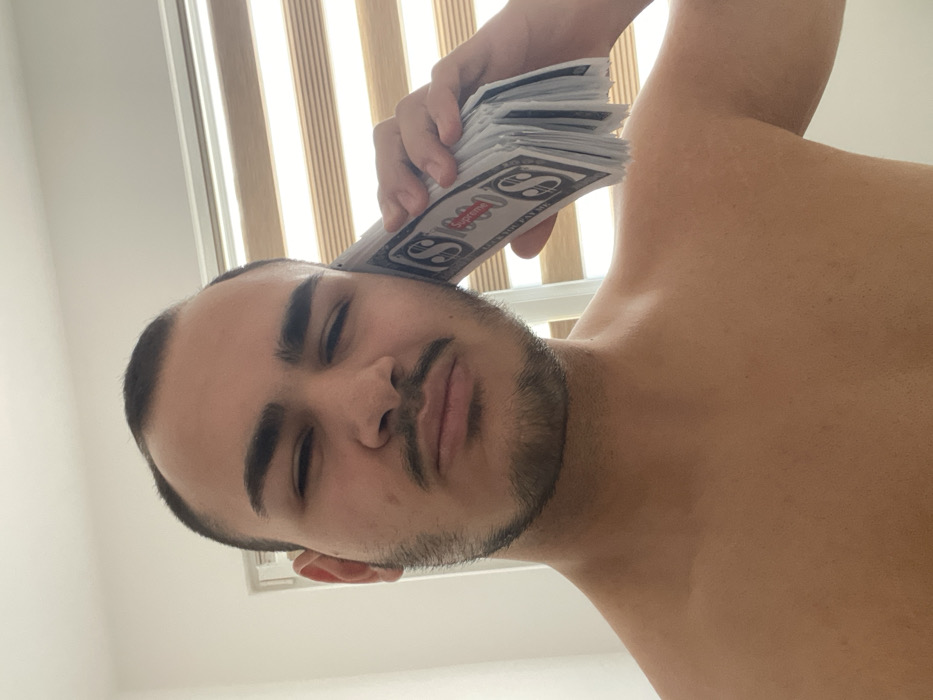 A close-up selfie depicts a young adult male, shirtless, with short dark hair and a neatly trimmed beard and mustache. He holds a thick stack of novelty bills, predominantly white with a black 'S' logo and 'Supreme' in a red box, to his right ear, mimicking a phone. His expression is serious, with lips slightly pursed. The background is a plain, light-colored wall on the left and a window with horizontal Venetian blinds on the right. The specific location within the city of Varna, Bulgaria, cannot be determined from the image.