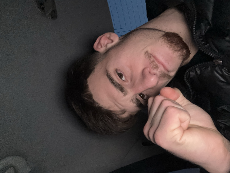 A man with brown hair, a goatee, and brown eyes looks at the camera while reclining. He is wearing a shiny black puffer jacket. His hand is visible, clenched into a fist near his face. The background appears to be the interior of a vehicle, with a dark gray surface behind his head and a blue panel visible above. The image is slightly rotated, creating a tilted perspective.