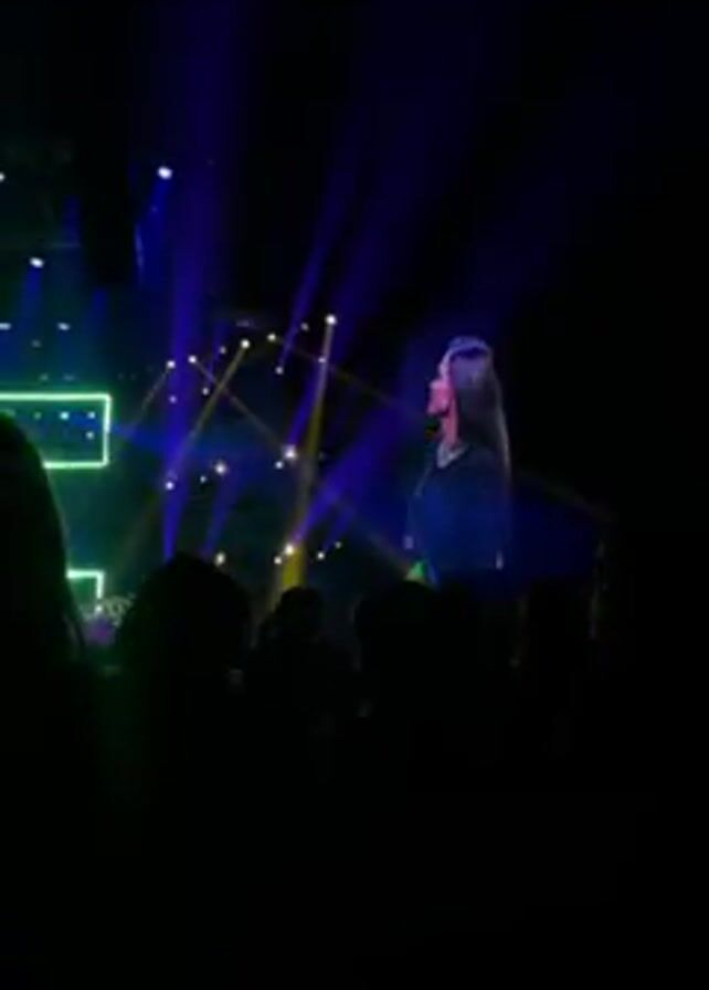A concert is underway. A large screen displays a performer singing into a microphone, while the stage is lit with blue and yellow spotlights. The audience is visible in silhouette in the foreground. A man wearing a white shirt and dark pants is then shown singing on the screen. Bright lights, including neon green, flash around him. The audience remains silhouetted. The environment is dark, focusing attention on the brightly lit stage and screen.