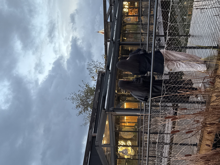 In Reichstett, France, an image depicts two individuals standing on an elevated wooden walkway with a metal mesh railing, viewed from behind under an overcast, grey sky. The person on the left wears a dark, long coat and white footwear. The person on the right wears a dark top, light-colored trousers, and carries a dark handbag on the right shoulder. Both individuals possess long, dark hair and face a modern building with extensive glass windows, through which warm interior lighting is visible. The building's left section displays a circular neon sign featuring a figure and the text "BIG UP." The right section exhibits a neon sign with "B+B." The structure's roofline is dark. Behind the building, sparse deciduous trees are present, and a distinctive red and white conical structure rises in the far background on the right. In the immediate foreground, dried reeds or cattails protrude from below the walkway, indicating a water or marshy environment. The scene suggests an evening or late afternoon setting due to the sky conditions and illuminated building interior.