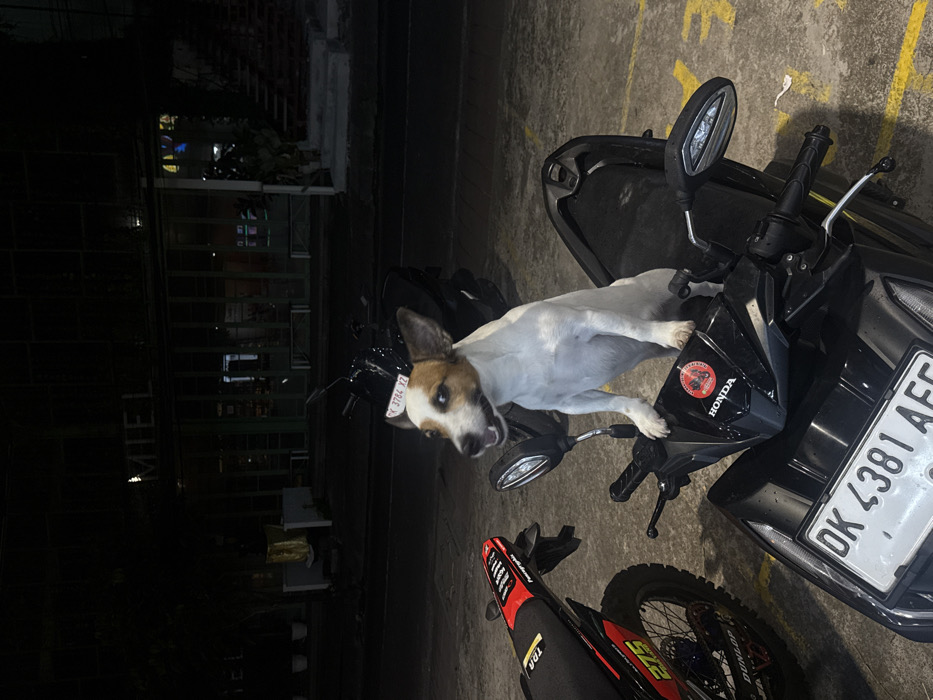The image depicts a nighttime scene in Canggu, Bali, Indonesia, captured from a slightly elevated perspective. In the foreground, a small, white-bodied dog with brown markings on its head and ears stands upright on a black Honda scooter. Its front paws rest on the handlebars, and its hind legs are positioned on the seat. The scooter's front license plate, "DK 4381 AEF," is clearly visible. Behind the dog's head, a temporary paper license plate, "K 3784 XZ," is attached to another scooter's dashboard. To the immediate left of the central scooter, a red and black dirt bike with a "Pirelli" branded seat and a "Dunlop" tire is parked. The background features a modern, two-story building with large glass windows and light-colored frames. The illuminated word "MIEL" is prominently displayed on the building's facade. Potted plants are visible near the building's entrance, and a set of concrete steps ascends on the right side. The ground is dark asphalt or concrete, marked with faded yellow lines, possibly indicating parking spaces. The scene is illuminated by artificial lights emanating from the building sign and ambient street lighting, with some reflections visible on the ground, suggesting a damp surface. No people are visible in the frame.