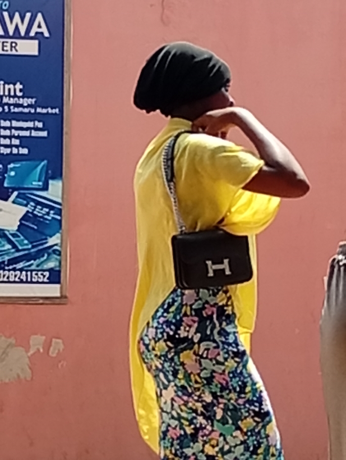 The image displays an individual positioned in the city of Unknown, Unknown, standing outdoors against a light reddish-pink painted wall. The person, observed from their right side, wears a black head covering, a bright yellow short-sleeved top, and a dark-colored long skirt adorned with a multi-colored floral pattern. A small black rectangular shoulder bag, featuring a silver chain strap and a prominent silver 'H' emblem, is worn across their body, resting on their right hip. The individual's right hand is raised to the back of their neck or lower head. To the left of the individual, a blue and white rectangular sign is mounted on the wall, displaying text such as "AWA," "int," "Manager," "Samaru Market," and a partially visible phone number "028241552," along with graphics of electronic devices. The wall exhibits minor surface wear. A portion of another person's lower leg, clothed in light fabric, is visible on the far right edge of the frame. The scene is brightly lit by natural sunlight.