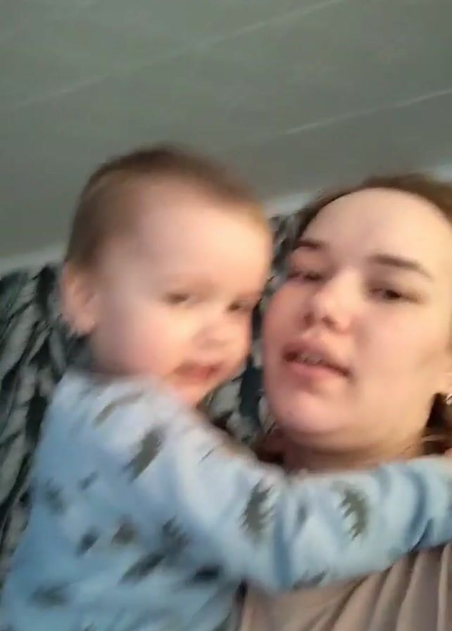 A woman holds a small child in her arms. The child wears a light blue dinosaur-patterned pajama top and red and black plaid pajama bottoms. The child looks down at first, then up at the camera, smiling. The woman smiles as well. They appear to be indoors, with a white ceiling and patterned wallpaper visible in the background. The woman wears a light-colored shirt and earrings. The audio suggests that they are about to go wash.