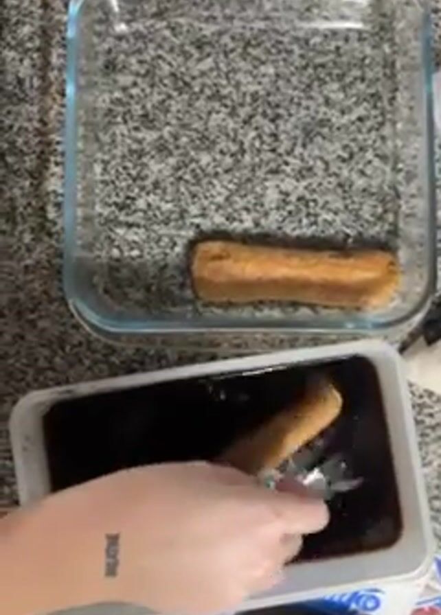 A top-down shot shows a person dipping ladyfingers into a dark brown liquid and then placing them into a clear glass baking dish