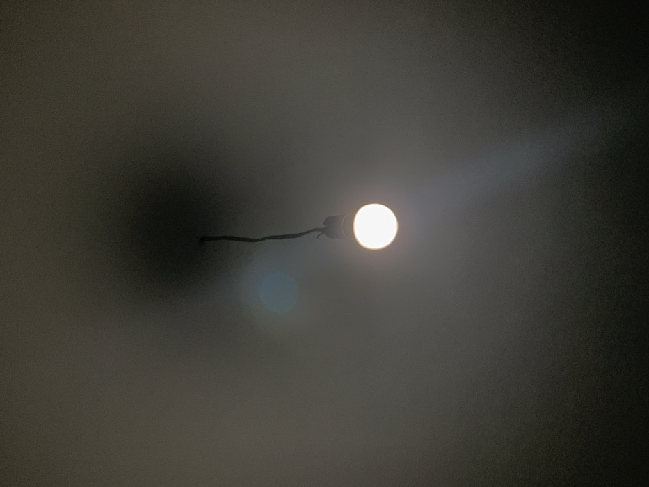 A single, bare light bulb illuminates a dark, foggy space
