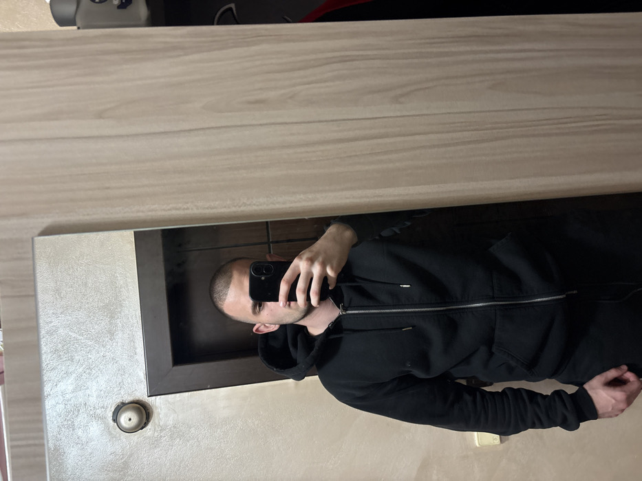 This image depicts an indoor mirror selfie taken in the city of Montana, Bulgaria. The primary subject is an adult male with short, buzz-cut hair, wearing a black zip-up hooded sweatshirt and black trousers. He holds a black smartphone vertically with his right hand, obscuring the left side of his face. The reflection in the mirror reveals a light beige, textured wall with a circular, light-colored fixture mounted on it to the left, and a dark brown doorframe directly behind the individual. To the right of the reflection, light wood-grain paneling, likely a wardrobe door, is visible. Partially seen in the upper right background reflection are a bottle with a blue and silver label and a red garment hanging inside a dark recess. The scene is illuminated by interior lighting.