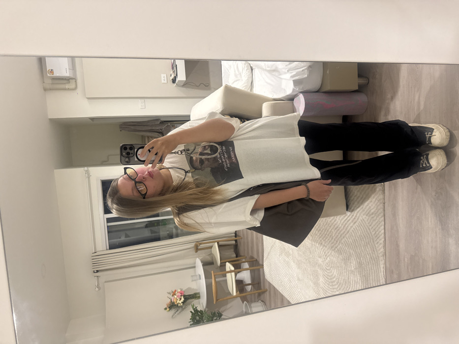 A full-length mirror selfie captures a young adult female in an indoor setting, identified as an apartment or hotel room within Chiang Mai City Municipality, Thailand. The female, with straight blonde hair, wears black-rimmed glasses with yellow-tinted lenses, an oversized white t-shirt featuring a dark graphic print of a man in sunglasses with text below, black loose-fitting pants, and off-white platform sneakers with black laces. She holds a black smartphone, equipped with a ring stand and a black strap, in her right hand to take the photo, while a dark gray tote bag is slung over her left shoulder. A black beaded bracelet is visible on her left wrist. She is making a pouting expression, looking directly at the phone. The reflected environment has light-colored walls and wooden floorboards, partially covered by a light-patterned rug. To the left, a small round white table with two light wooden chairs is set, displaying a white cylindrical planter with colorful flowers and a glass of water. Behind this, a large glass sliding door with white sheer curtains reveals subtle outdoor greenery. To the right, an unmade bed with white linens and a light-colored upholstered backrest is visible. A pink patterned roll, possibly a yoga mat, stands upright near the bed. Above, a white wall-mounted air conditioning unit and a small floating white shelf are present, along with a light-colored fabric item hanging on a hook. The room is illuminated by ambient artificial light.